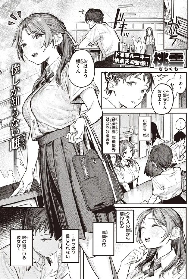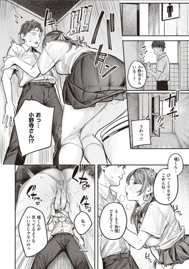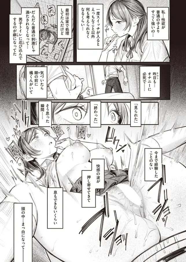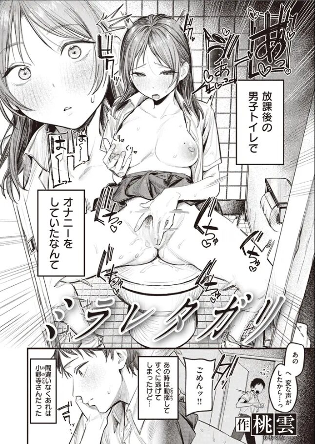 橘くんは、そんな小野寺さんが男子トイレでオナニーしているところを目撃してしまうのです。